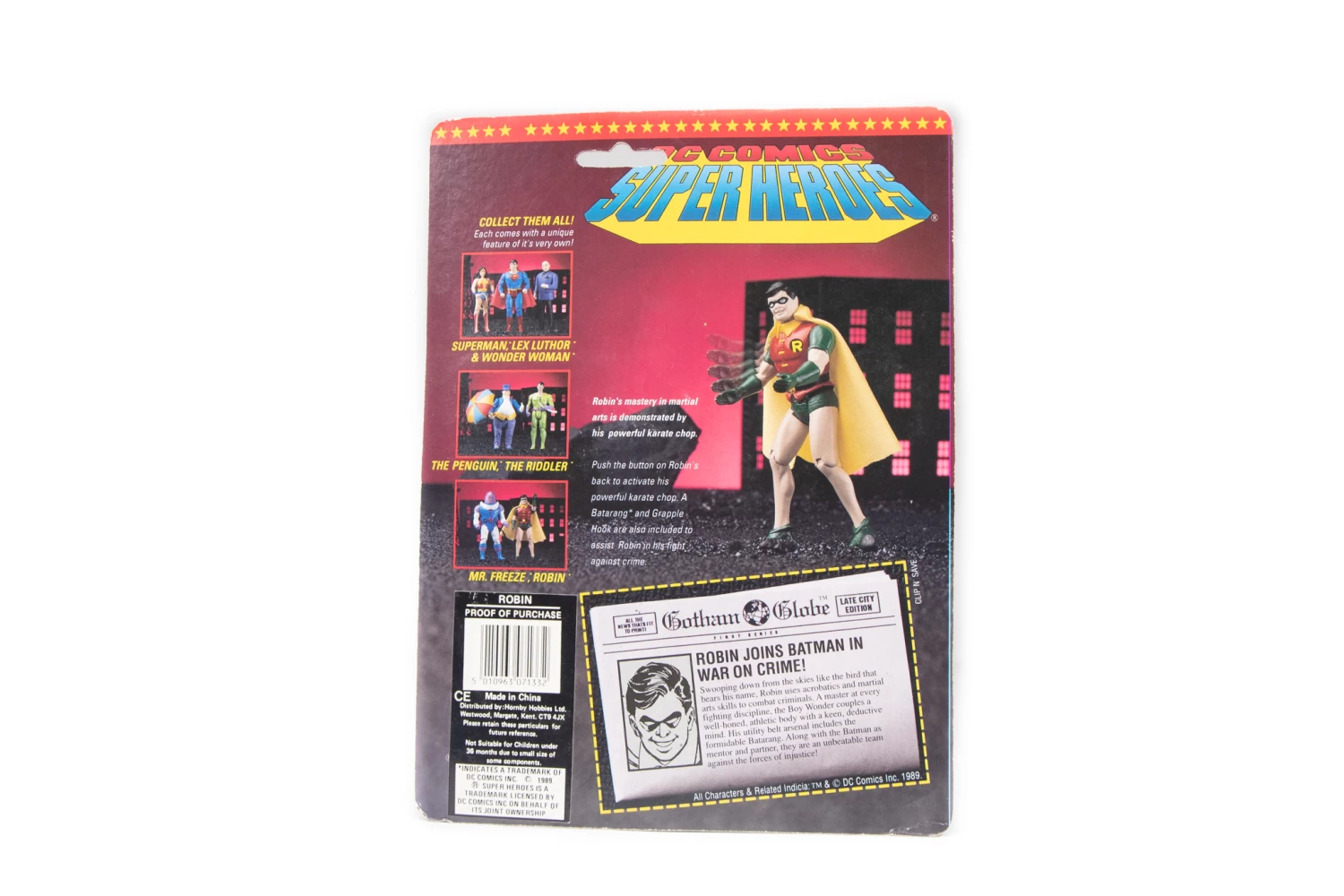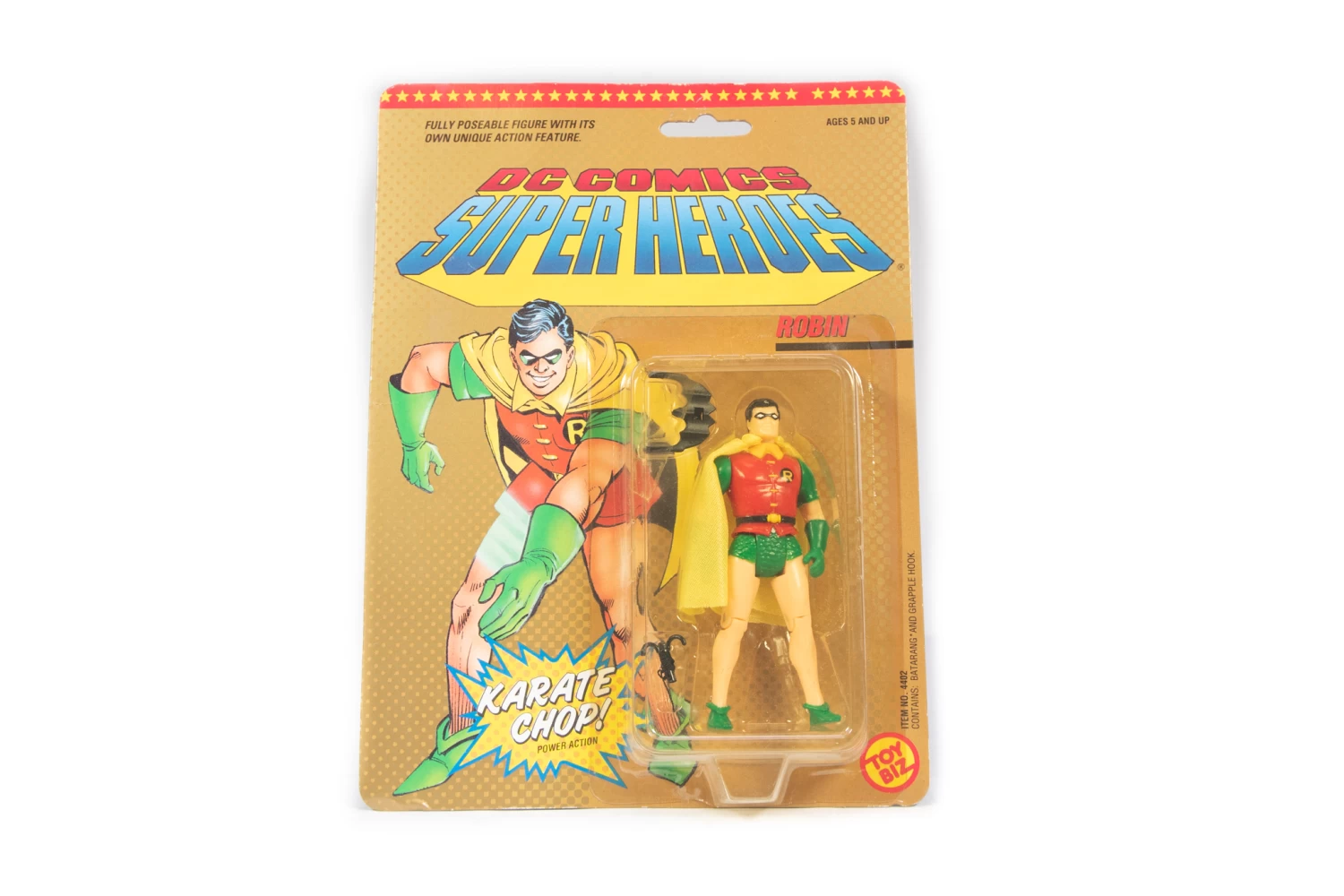 Robin’s mastery in martial arts is demonstrated by his powerful karate chop. Push the button on Robin’s back to activate his powerful karate chop. A Batarang and Grapple Hook are also included to assist Robin in his fight against crime.