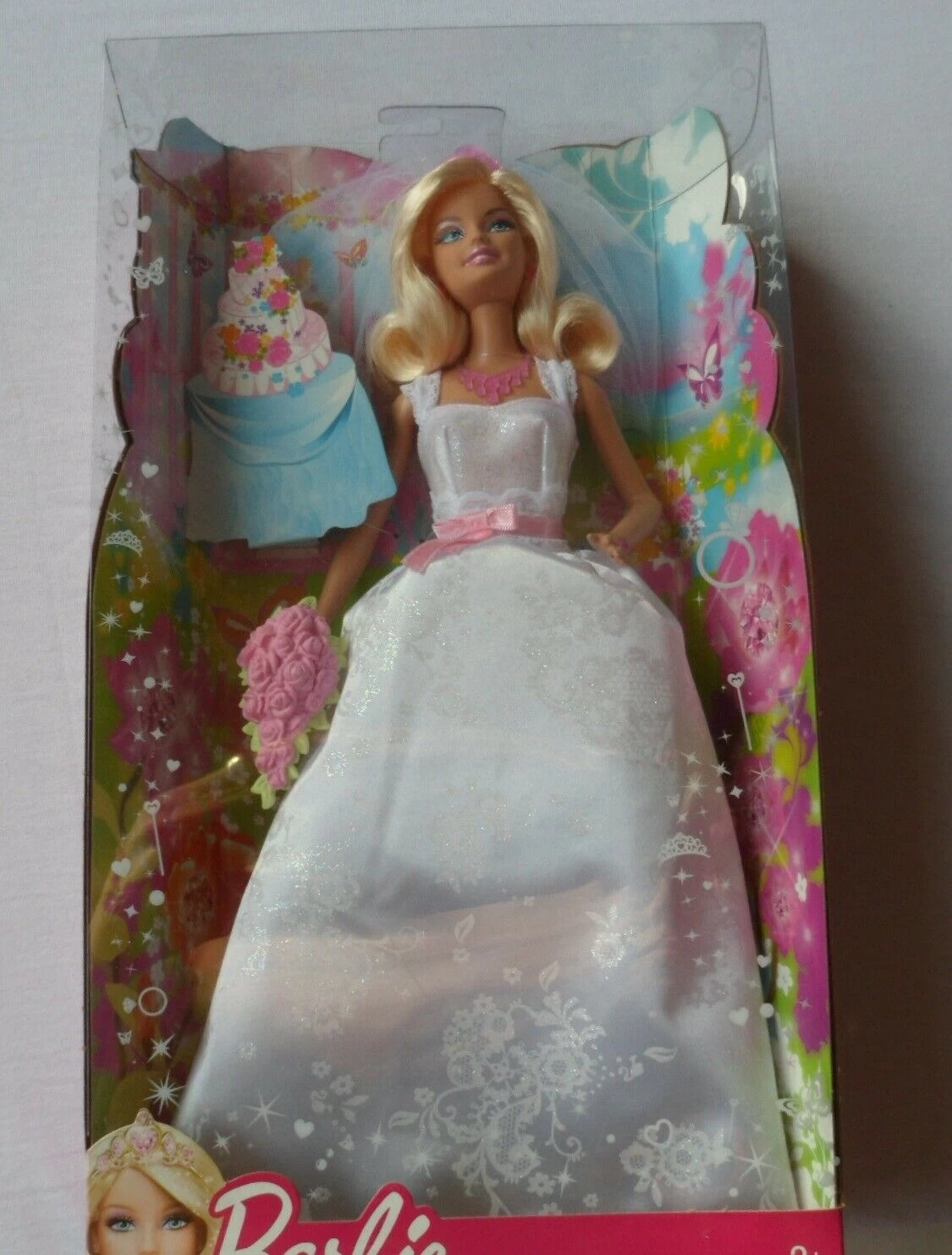 Girls can recreate fairytale moments or play out their own wedding-day dreams with this beautiful bride. Carrying a bouquet of pink flowers and wearing charming accessories, she will captivate as she walks down the aisle. Her sweet white gown is accented with enchanting touches of glitter, lace and pink to create the perfect look to begin her happily ever after!