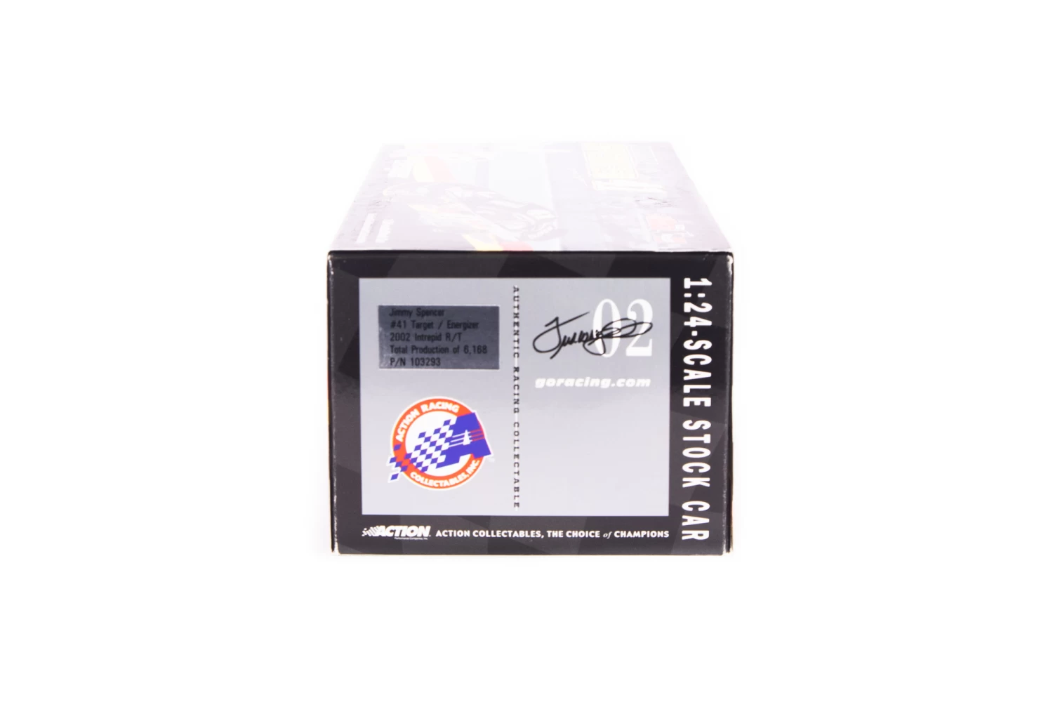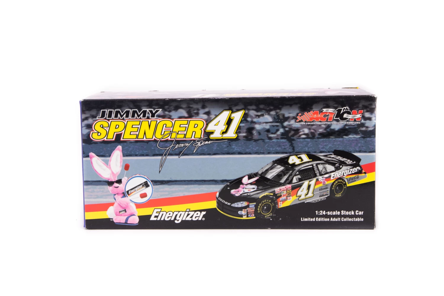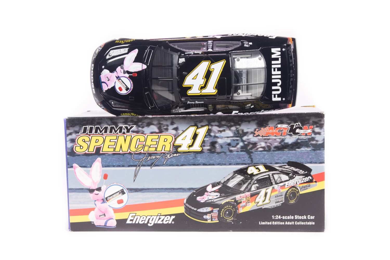 This 1/24th scale diecast replica model has moving wheels and opening engine bay with lots of details throughout. This is an identical scale replica of #41 Target / Energizer Stock Car driven by Jimmy Spencer.