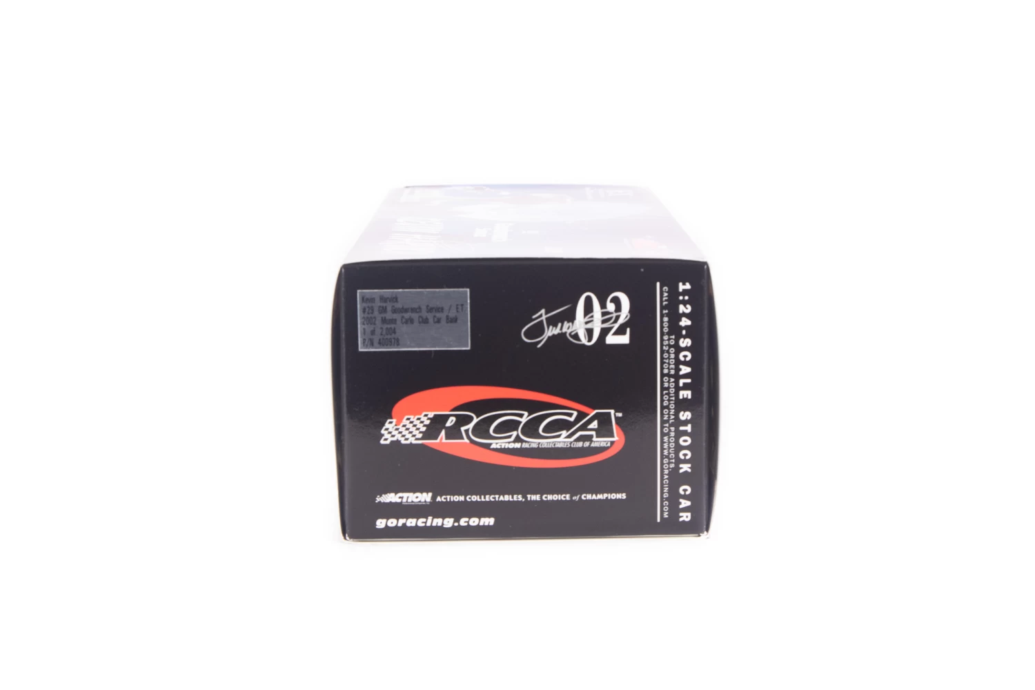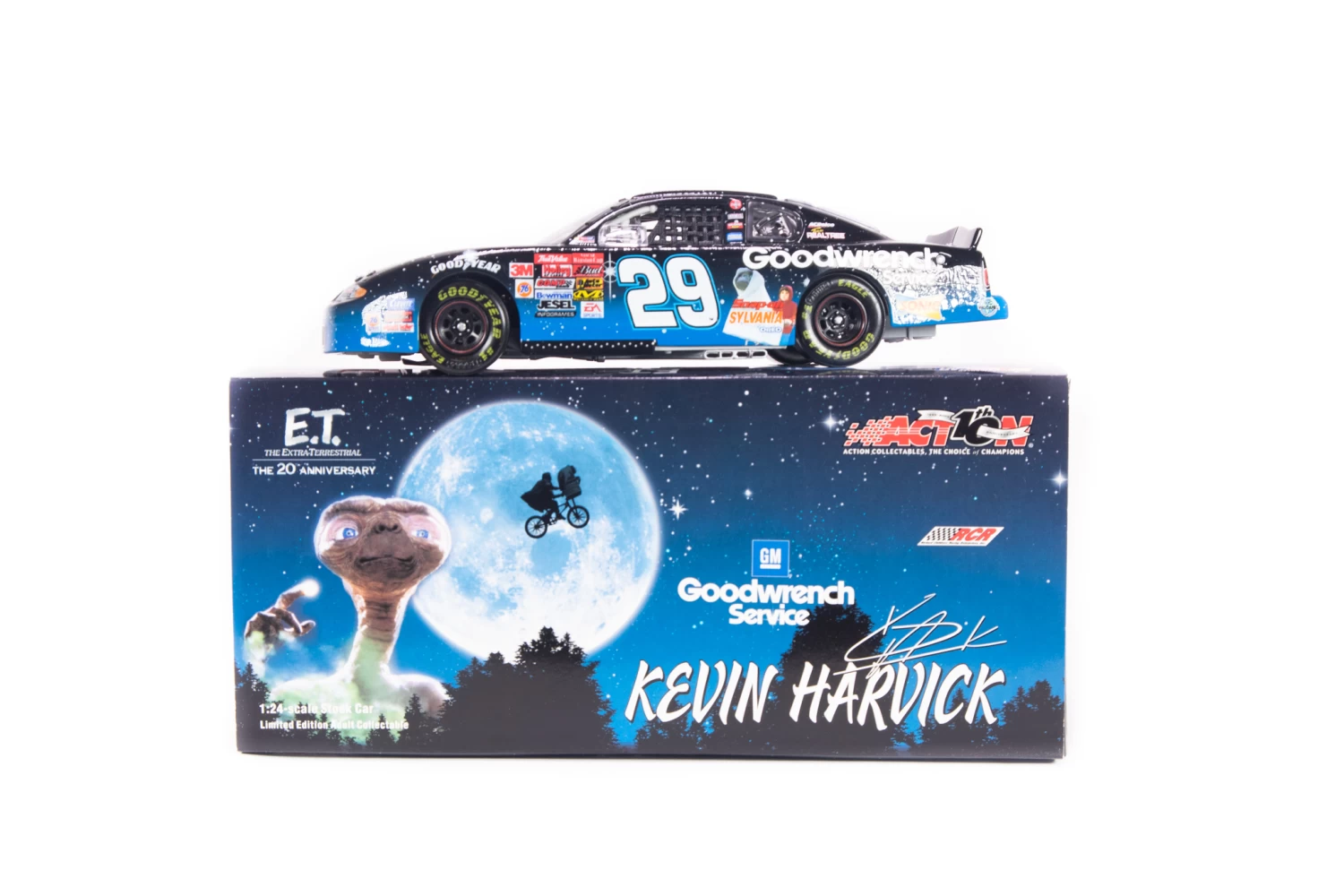 This 1/24th scale diecast replica model has moving wheels and opening engine bay with lots of details throughout. This is an identical scale replica of #29 GM Goodwrench Service / E.T. Stock Car driven by Kevin Harvick.