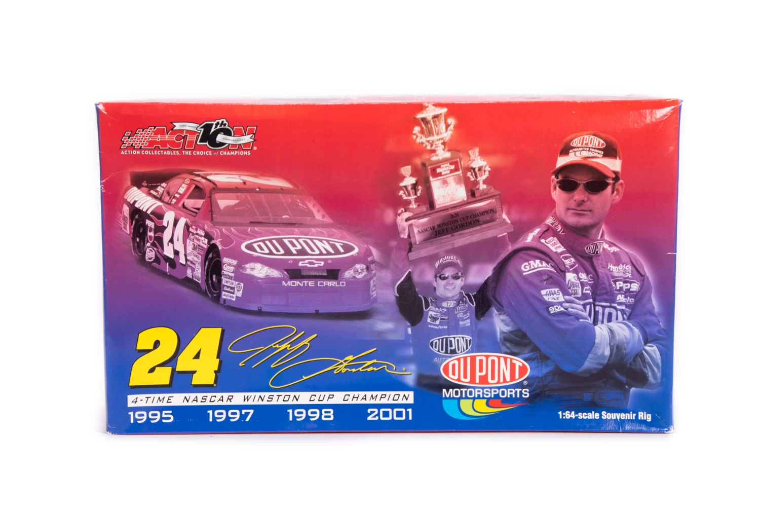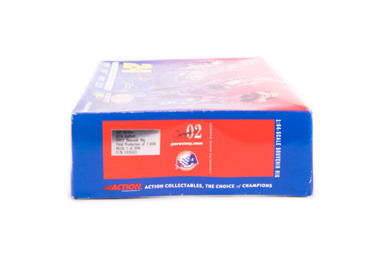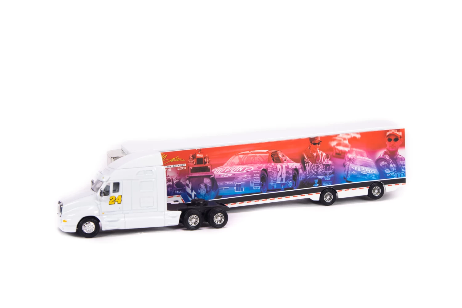 This 1/64th scale diecast replica model has moving wheels and opening trailer. This is scale replica of #24 DuPont 2002 Rig for Jeff Gordon