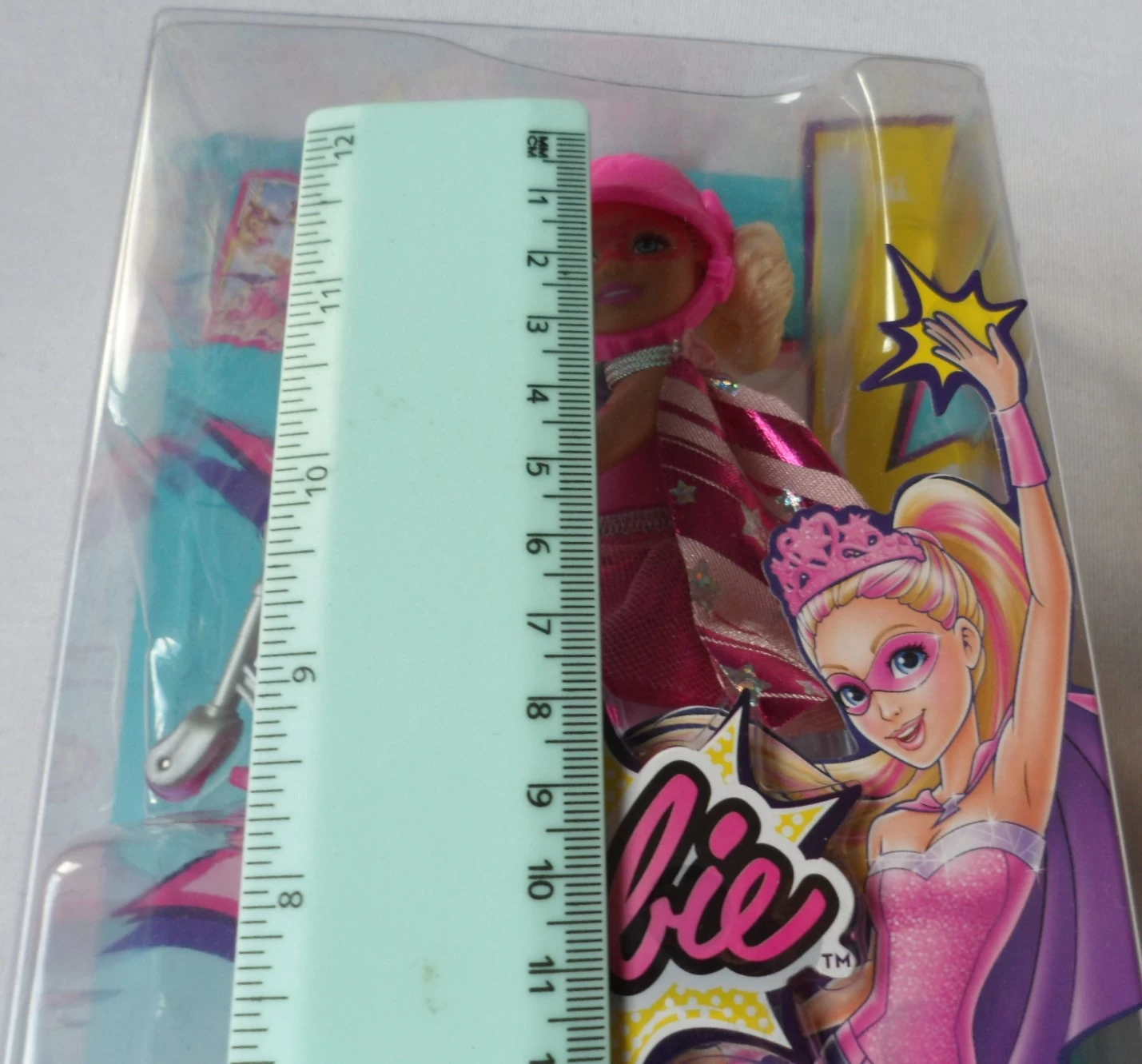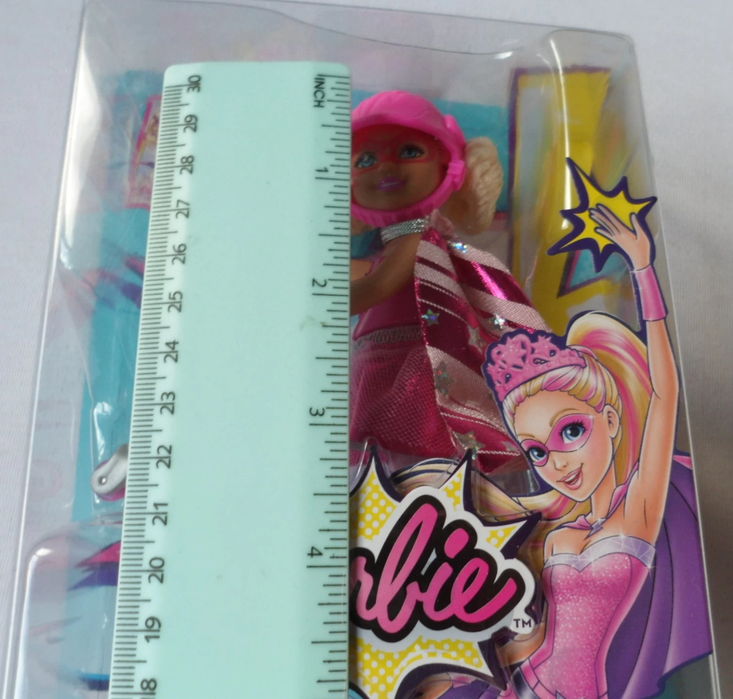 Girls can play out the story with this adorable Chelsea doll dressed up as her favorite superhero! Plus, she comes with a scooter so she can get to the action quickly. Chelsea sparkles in a pink shiny dress with star-decorated cape, tall boots and matching helmet. Place her onto the scooter, sliding feet and hands into the slots, to speedily show her support. Her scooter matches her costume and has adorable superhero details.