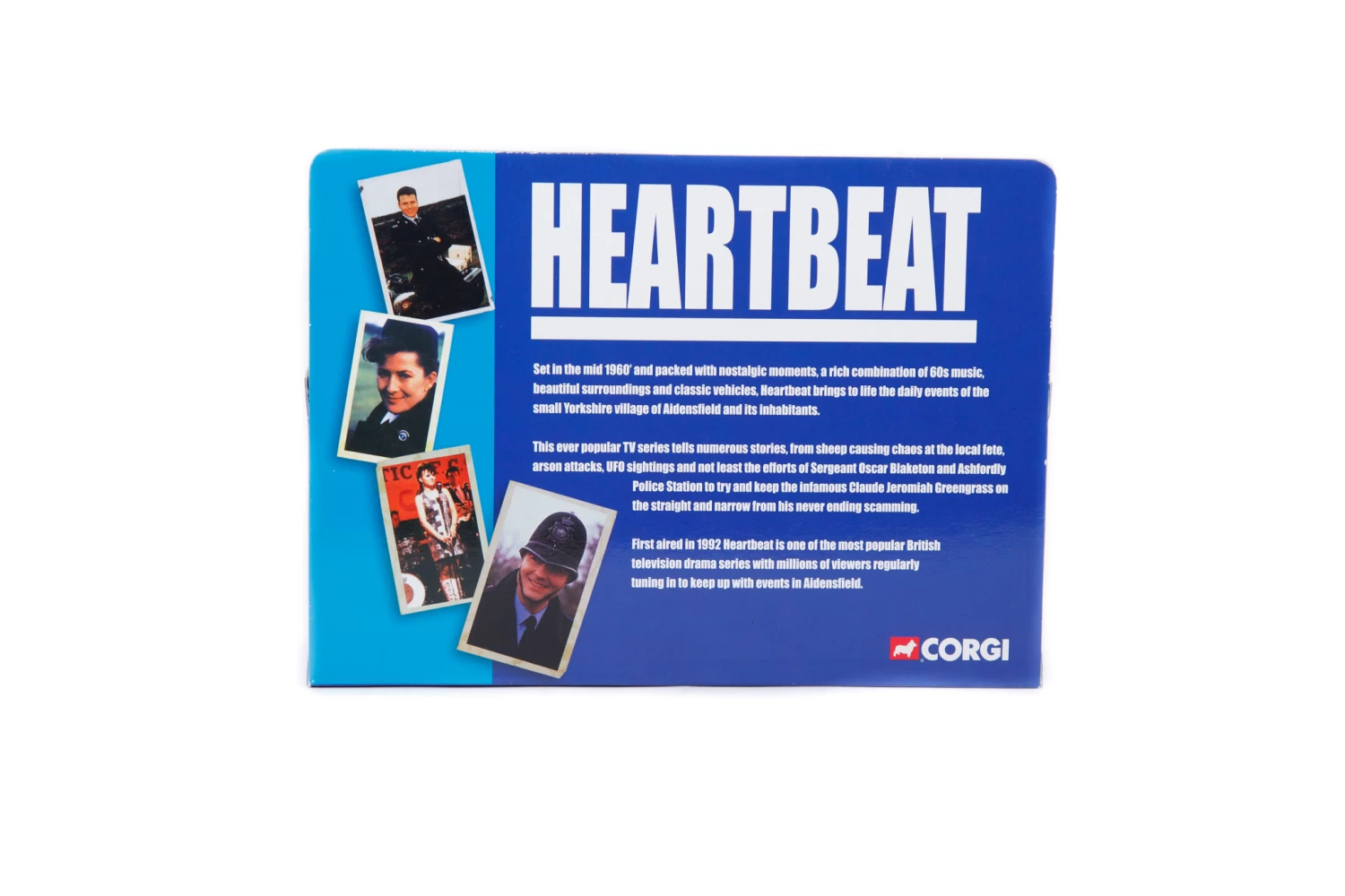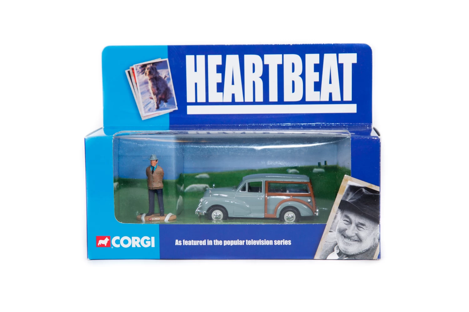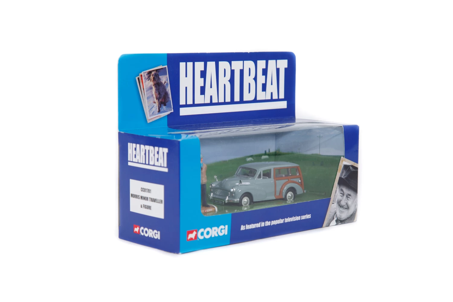This is a 1:43 Scale diecast replica of the Morris Minor Traveller and Oscar Blaketon from Heartbeat.
