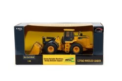 Die-cast scale model of a Bell L2706D Wheeled Loader that features wheels that roll with actual tread design, and a bucket that scoops and dumps and raises and lowers. The cabin windows are clear to show interior detail.