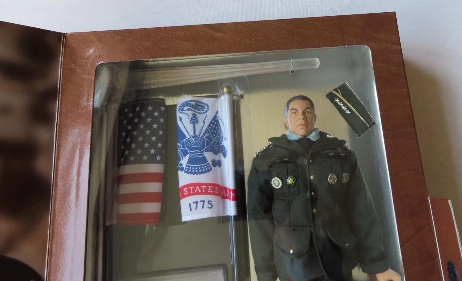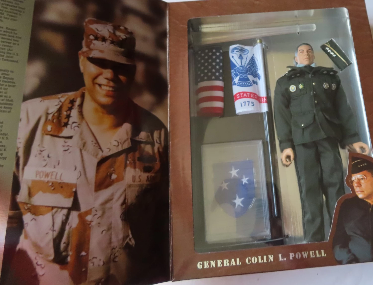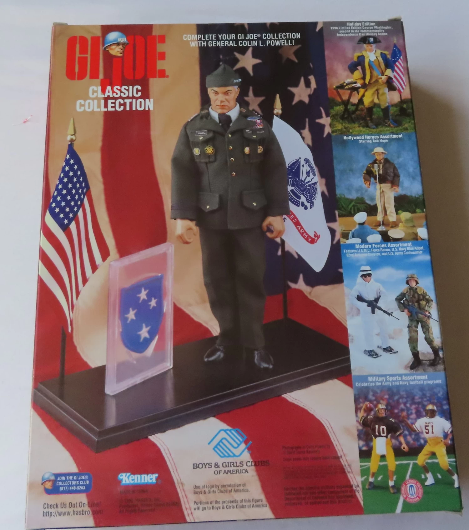 The 1998 General Colin Powell vinyl celebrity doll was manufactured by Hasbro/Kenner as 4th in a series of GI Joe classic edition. The doll is in complete dress uniform with all of General Powell’s awards and badges.