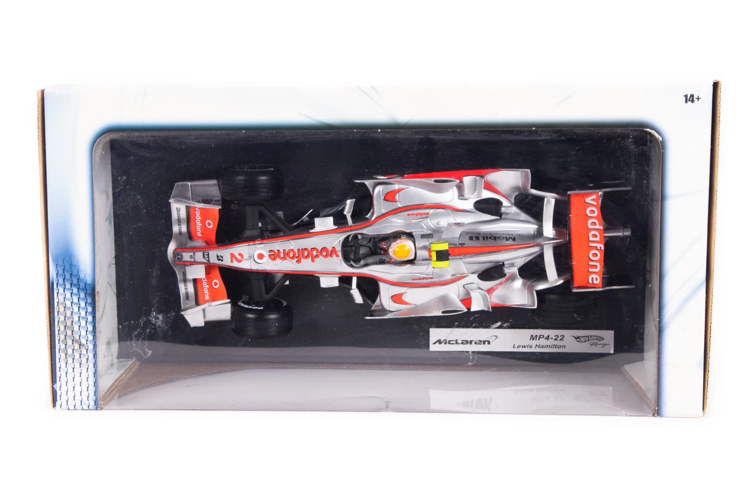 This 1/18th scale diecast replica model of a Formula 1 car. This is the McLaren F1 car from the 2007 Season. This is Lewis Hamilton’s MP4-22.