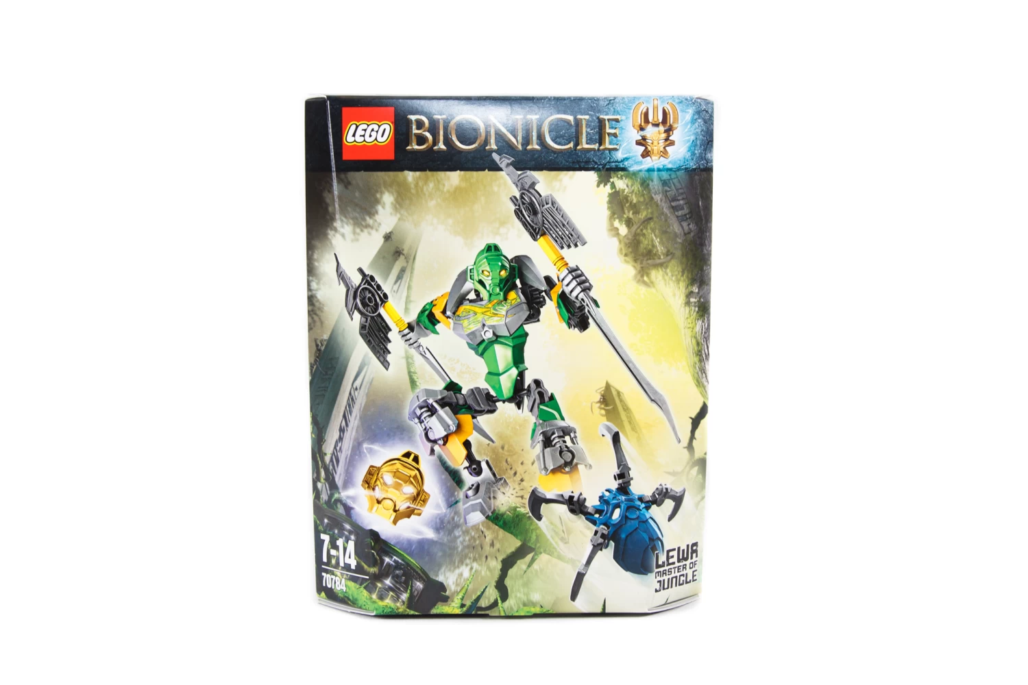 Grab the Golden Jungle Mask with LEGO BIONICLE Lewa – Master of Jungle with convertible X-glider/battle axes and battle arm function.