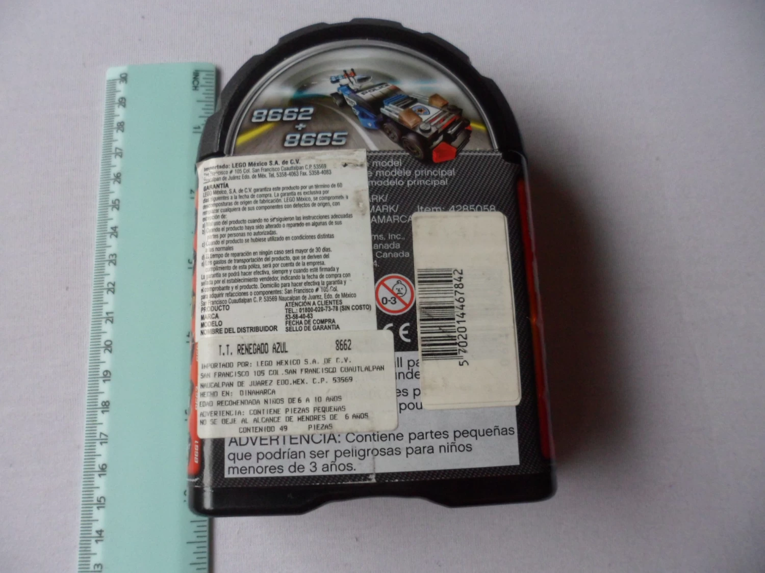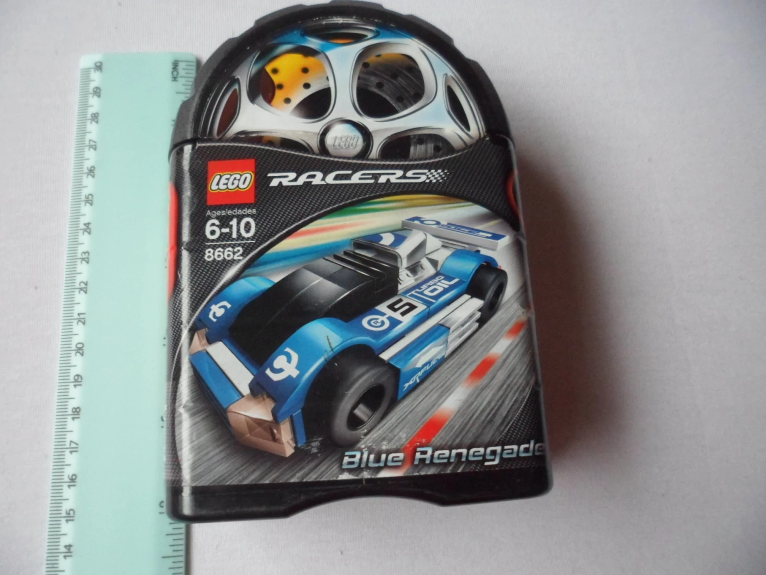 It contains 49 pieces to build a small blue racing car with a chrome engine and brown headlights.