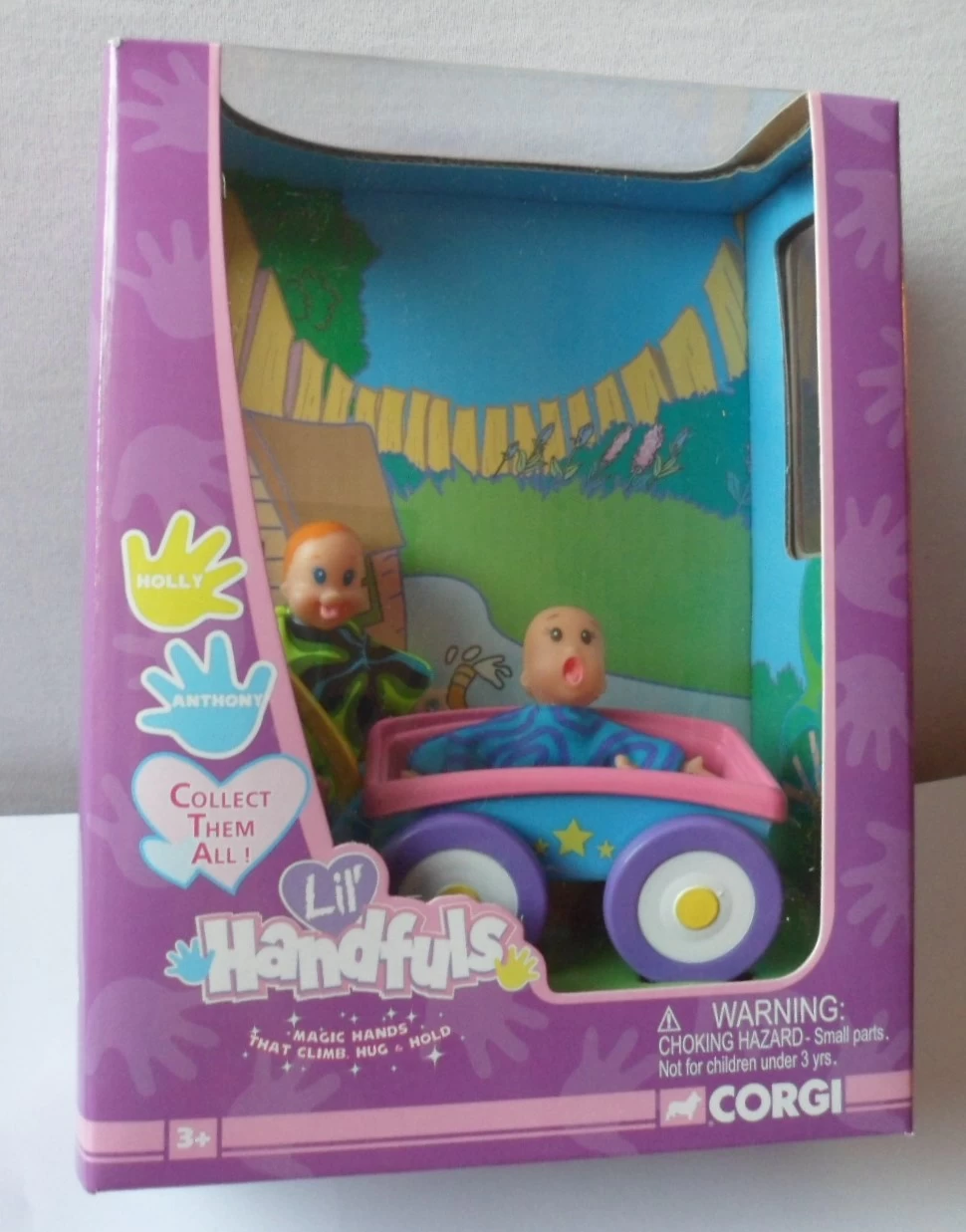 Lil’ Handfuls bean dolls by Corgi. They have magnets in their hands so they stick in any metal surface. They also have many different miniature accessories for display.