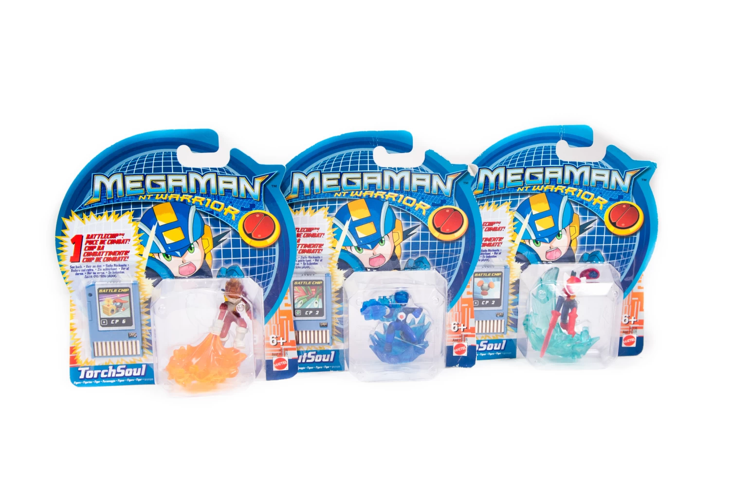 These 1″ figures of 3x Megaman from the Battlechip series, TorchSoul, ProtoSoul & SproutSoul