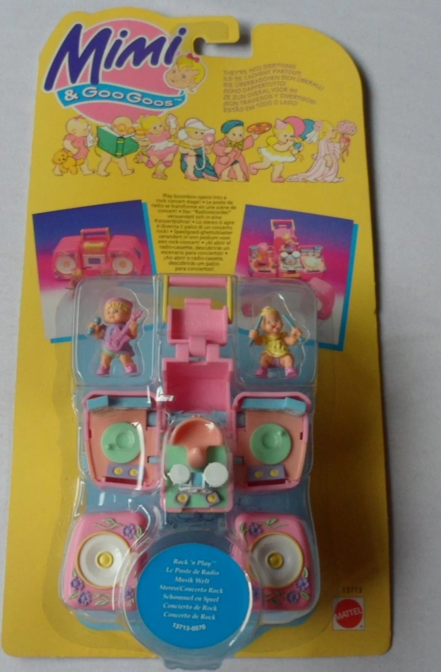 Mimi is an impish little girl who has her own imaginary world full of tiny, secret friends – the Goo Goos! Whenever Mimi’s sad, she just thinks of Goo Goo Land, and she’s off! Grown-ups never go to Goo Goo Land – it’s just for children, like Mimi. When the Goo Goos come out to play, they’re so cheeky – they hide in all kinds of funny places. Mimi and her friends the Goo Goos are having terrific fun in these exciting unique playsets. Each one opens out to reveal a surprise playscene which has a special movement feature operated by a thumbwheel.