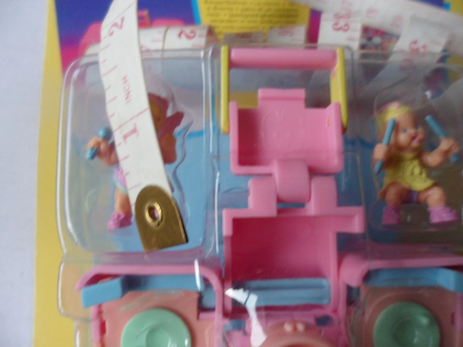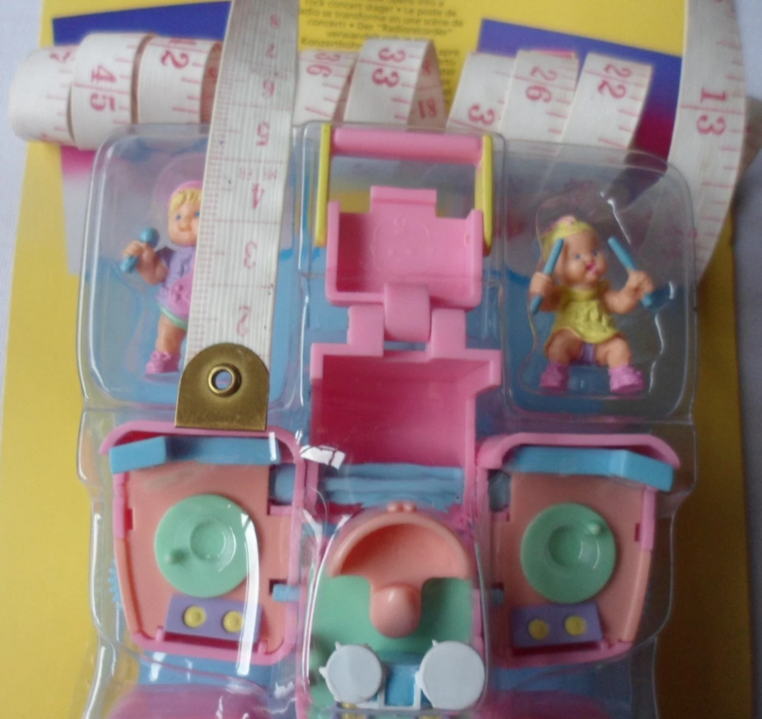 From a Boom box into a Rock concert stage. The front of the boombox folds down to create a stand for Trenda and her drumset. The front and back of the boombox speakers join together to create stage speakers for the concert and reveal two stage areas for Mimi to rock out on on her guitar. Turn either of the wheels to watch Mimi spin and the drumset rock back and forth. When the concert is over Mimi and Trenda hide away inside the boombox speakers until the next rocking show. Two figures included are Mimi and Trenda.