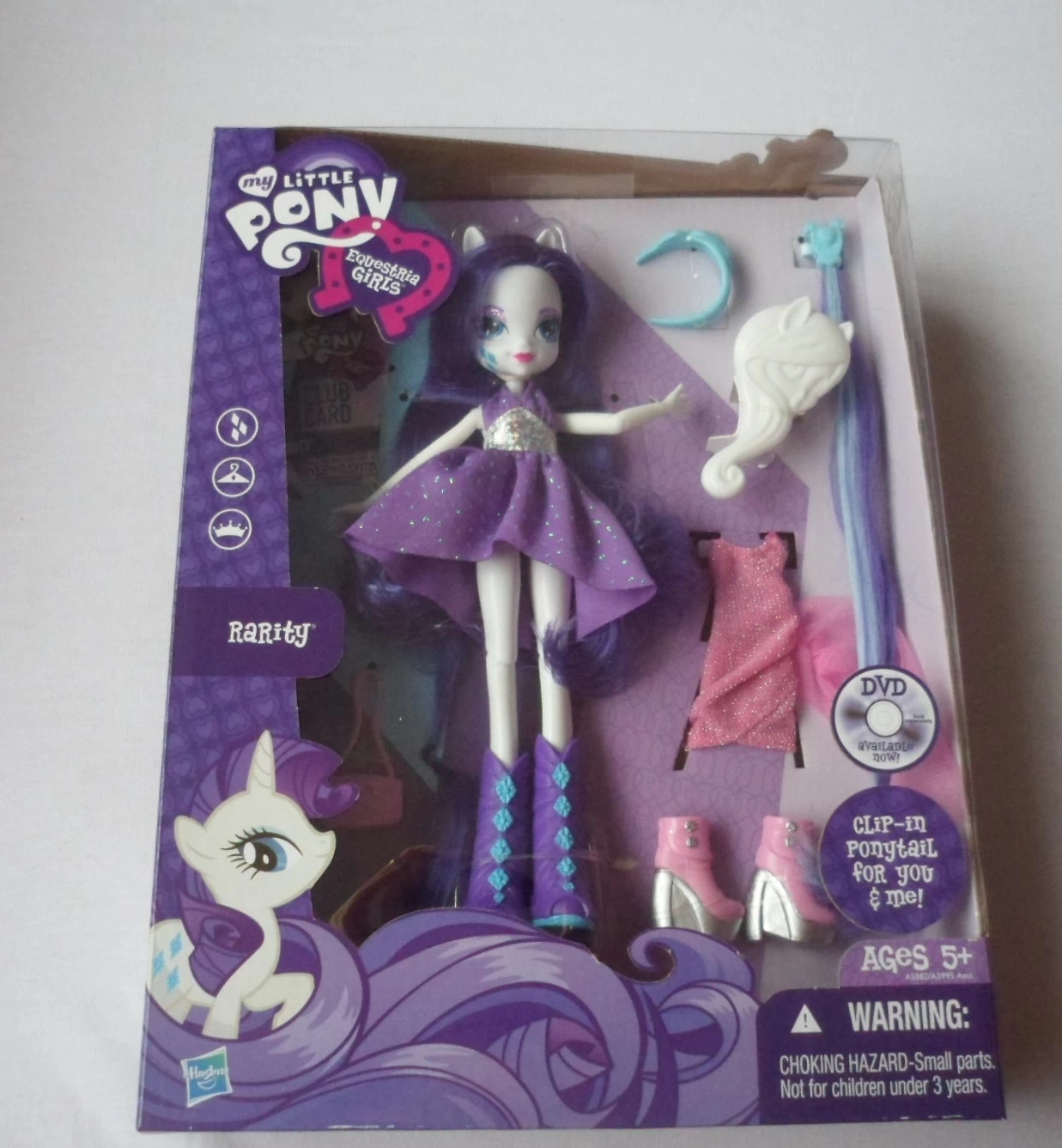Your Rarity doll canβt wait to show off her latest looks to her number one fan β you! This fancy girl comes with 2 style-savvy outfits and 2 pairs of adorable interchangeable shoes to match. Sheβs super-poseable with bendable knees and elbows, and sheβs ready to strike any fashion pose. She comes with a purse, wings and headband to accessorize, and a colorful ponytail hair clip that you can also wear! Youβll both look your best and youβll have all the Equestria Girls fun you can handle with your Rarity doll.