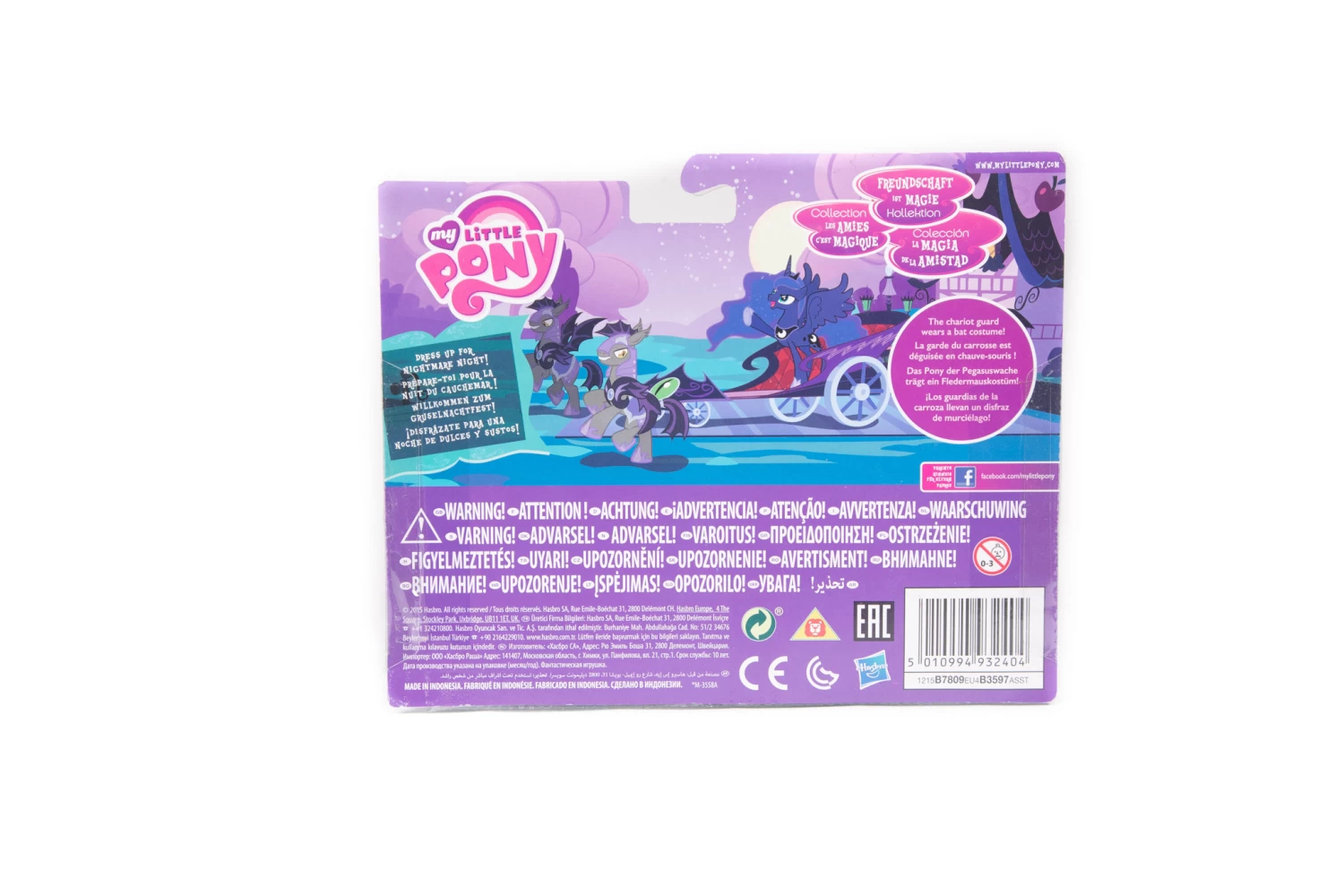 Fun and frights are astir in Ponyville as every pony dresses up for Nightmare Night! Let the adventure begin with this My Little Pony Friendship Is Magic toy Moonlight Chariot and Pony set. Dress the chariot guard in the included bat costume and prepare the moonlight chariot for a spooky-fun ride through Ponyville! The chariot comes with a rope accessory—perfect for gripping tightly on a nighttime chariot ride that is sure to bring about shrieks of delight!
