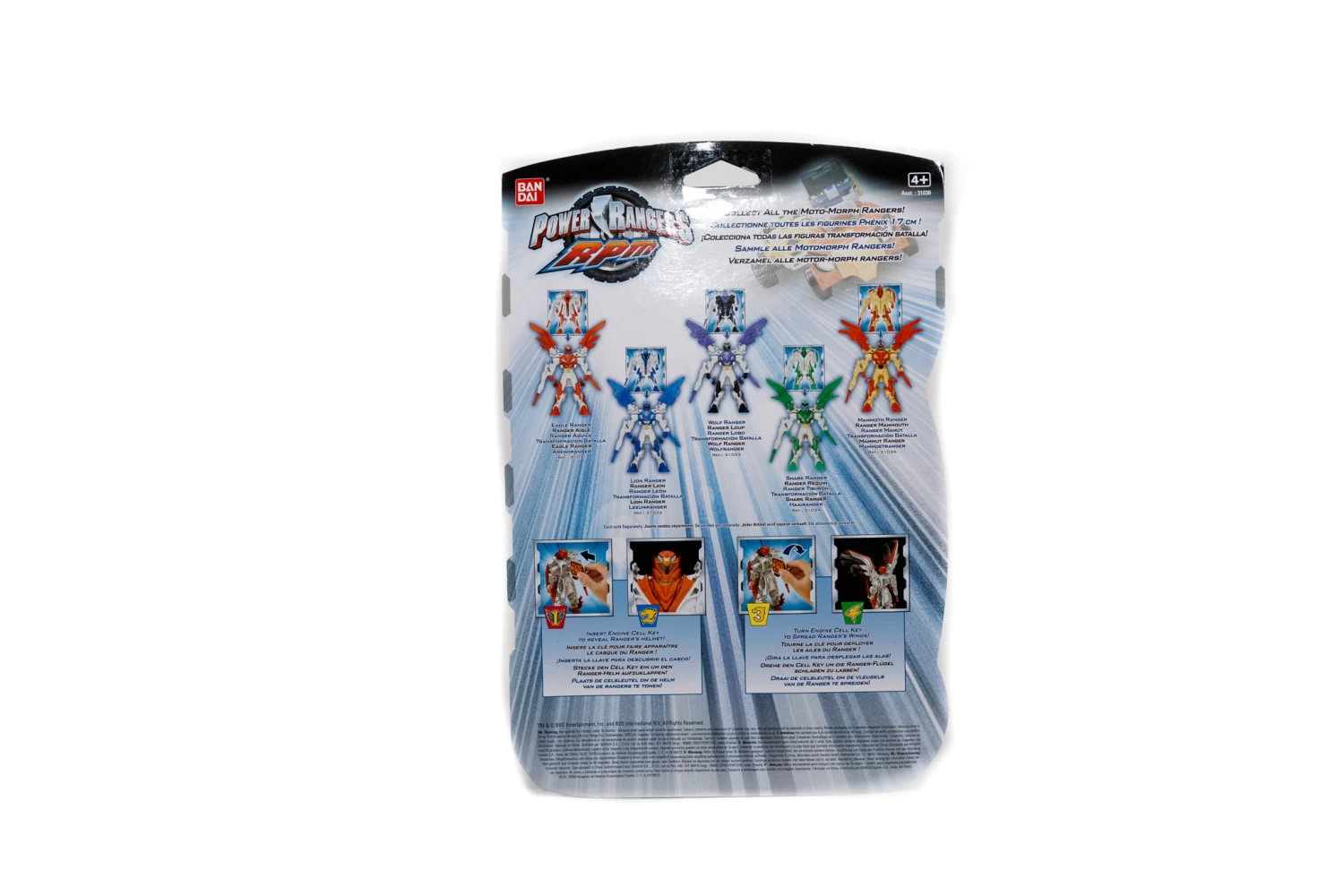 These 17cm figures Morph into action with the turn of the key. Inset the engine cell key to reveal their helmet then turn the key to spread their wings.