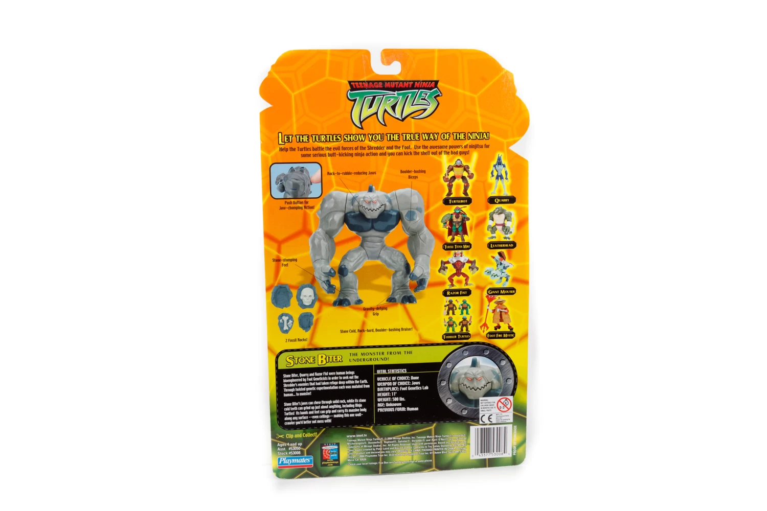 Stone Biterβs jaws can chew through solid rock, while its stone cold teeth can grind up just about anything, including Ninja Turtles! Its hands and feet can grip and carry its massive body along any surface β even ceilings β making this one wall-crawler youβd better not mess with!