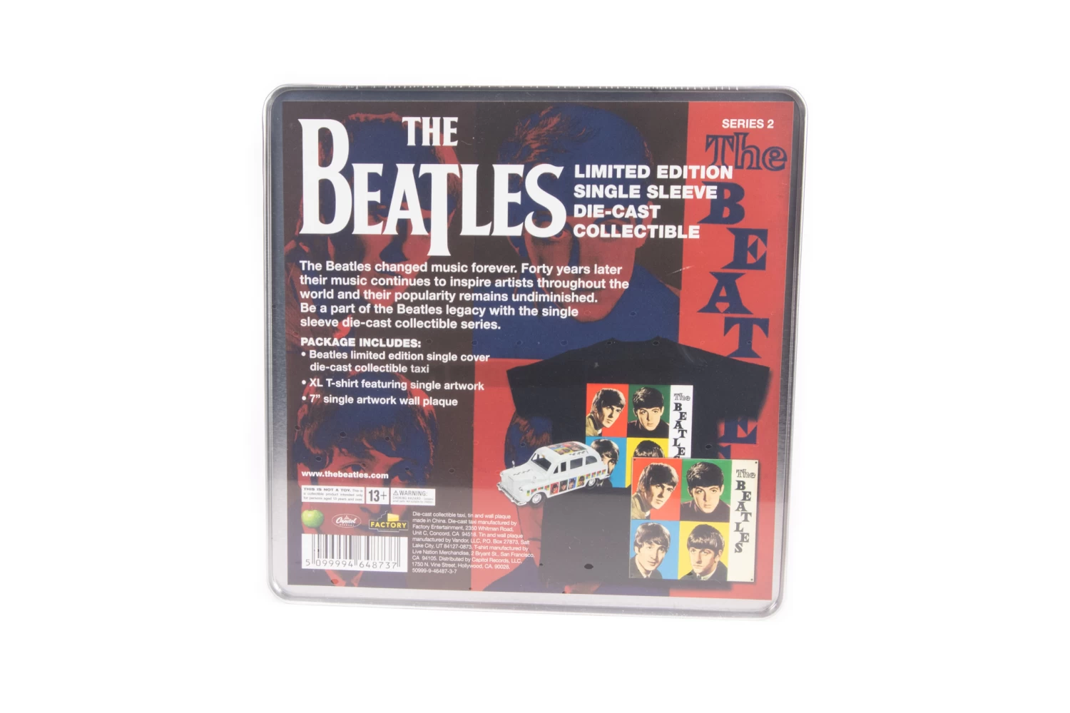 This is a collectible beatles tin that includes limited edition Single Sleeve Die-cast Collectible Taxi, XL T-shirt & 7″ Single Artwork Wall Plaque.