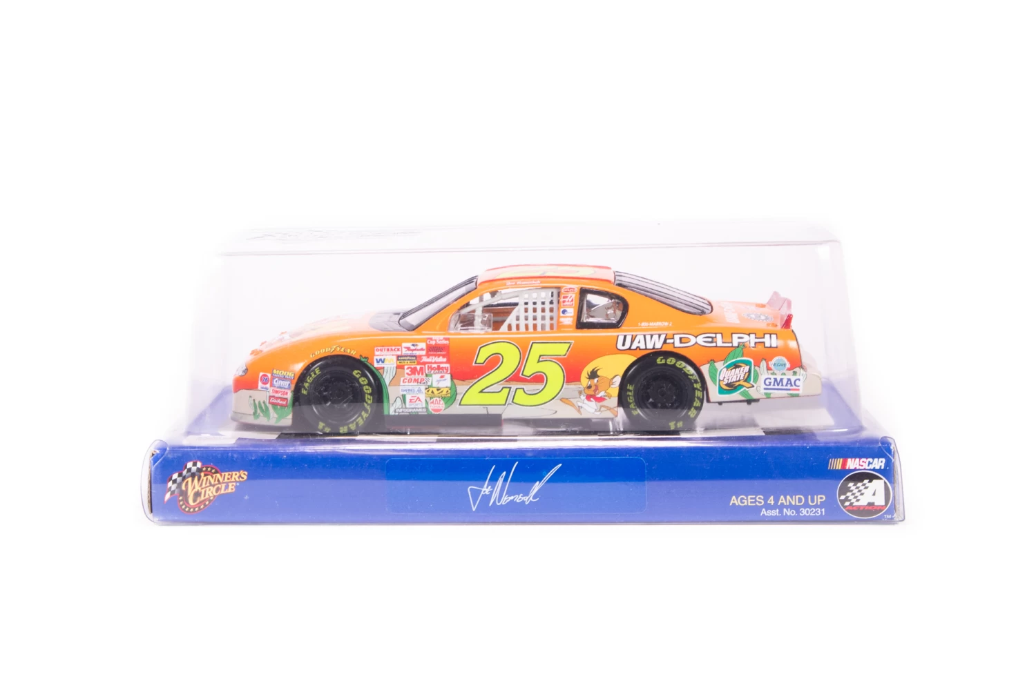 This 1/24th scale diecast replica model has moving wheels and opening engine bay with lots of details throughout. This is an identical scale replica of #25 UAW-Delphi / Looney Tunes Rematch “Speedy” Stock Car driven by Joe Nemechek.